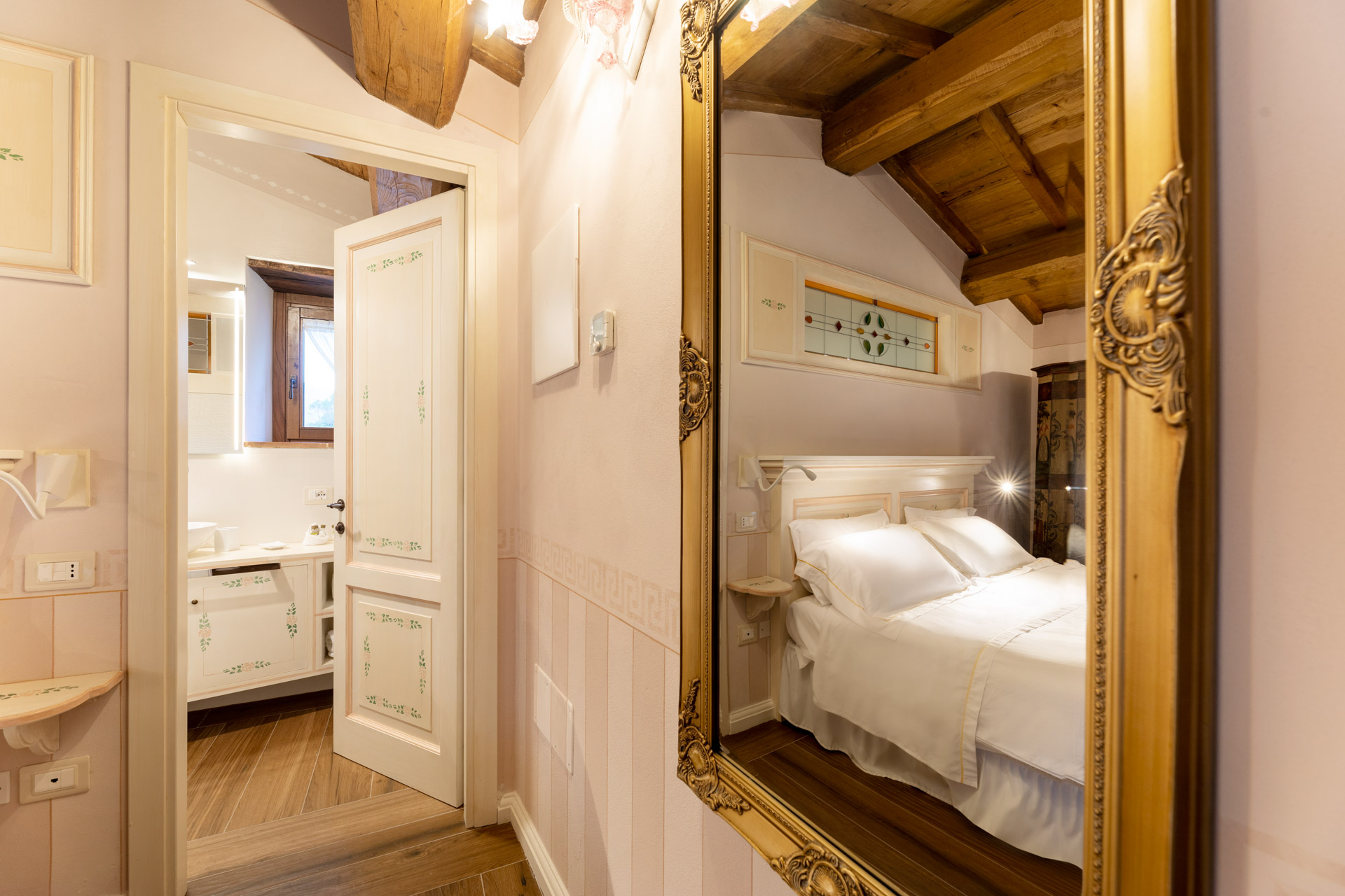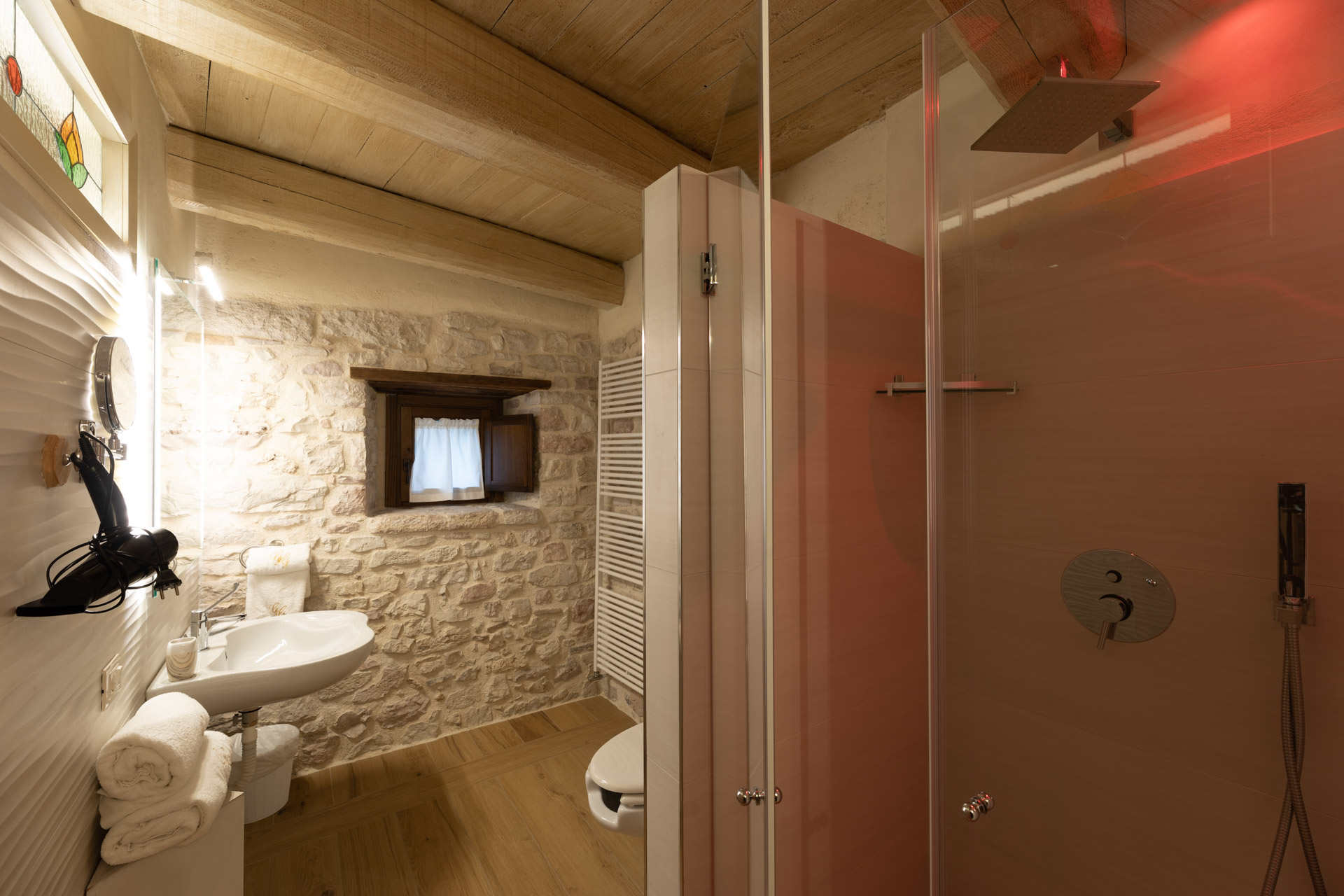 Le 12 camere nella Torre hanno invece conservato un forte carattere storico ed appaiono oggi come opere d’arte con le loro pareti affrescate, le travature di legno, gli archi in pietra, i vecchi pavimenti in graniglia impostate sull’uso di materiali trovati, rinvenuti, che narrano la storia di questi immobili.